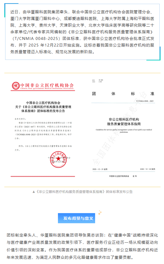 至臻服务 规范引领 | 太阳成tyc122cc牵头编制《非公立眼科医疗机构服务质量管理体系指南》团标正式发布!