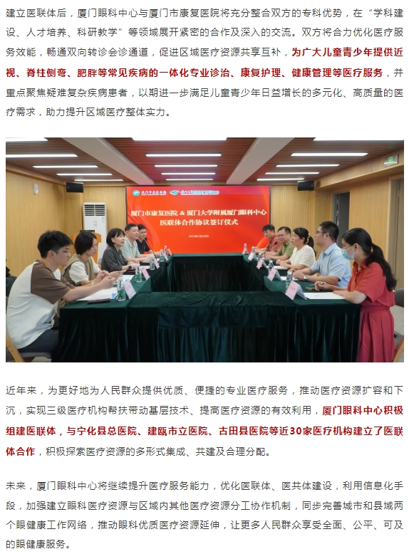 助力少年儿童健康成长,厦门眼科中心与厦门市康复医院建立医联体合作!