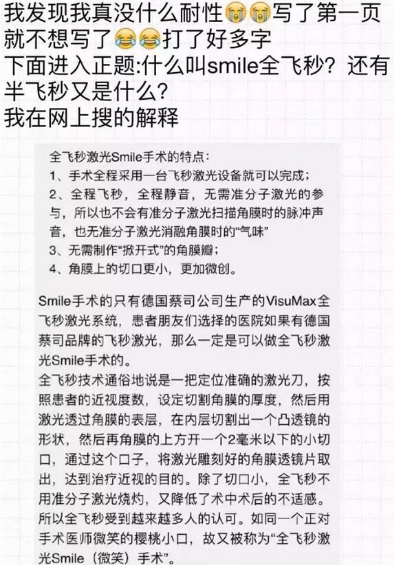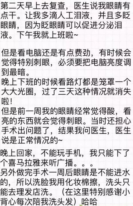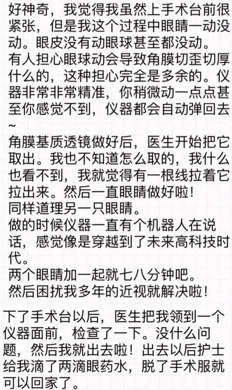 你好!我是2016年12月18日在和平眼科做过全飞秒的患者~现在已经摘掉眼镜了,特别开心!附件有一个我写的分享,一共是7页图片,希望能给其他还没做或者犹豫做手术的朋友们带来帮助。写了好几晚,终于写完了~