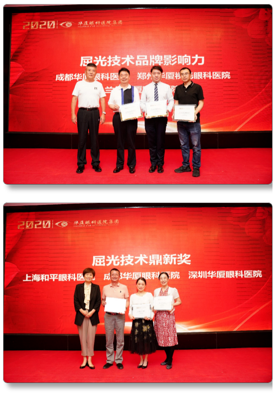 太阳成tyc122cc(中国)集团集团董事长苏庆灿先生为厦门大学附属厦门眼科中心颁发2020年屈光项目特别贡献奖,为郑州太阳成tyc122cc视光眼科医院刘苏冰团队颁发2020年集团屈光项目突出贡献奖,王骞教授、刘苏冰教授作为代表上台领奖。