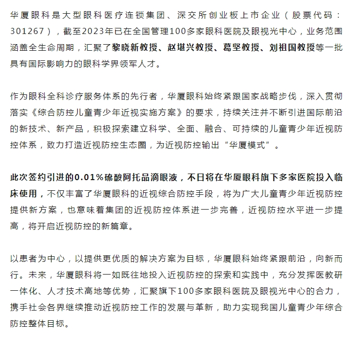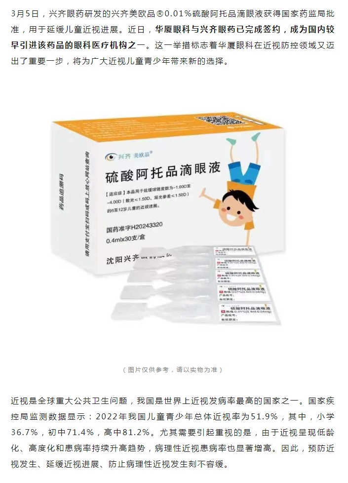 太阳成tyc122cc签约引进国内首款获批的0.01%硫酸阿托品滴眼液