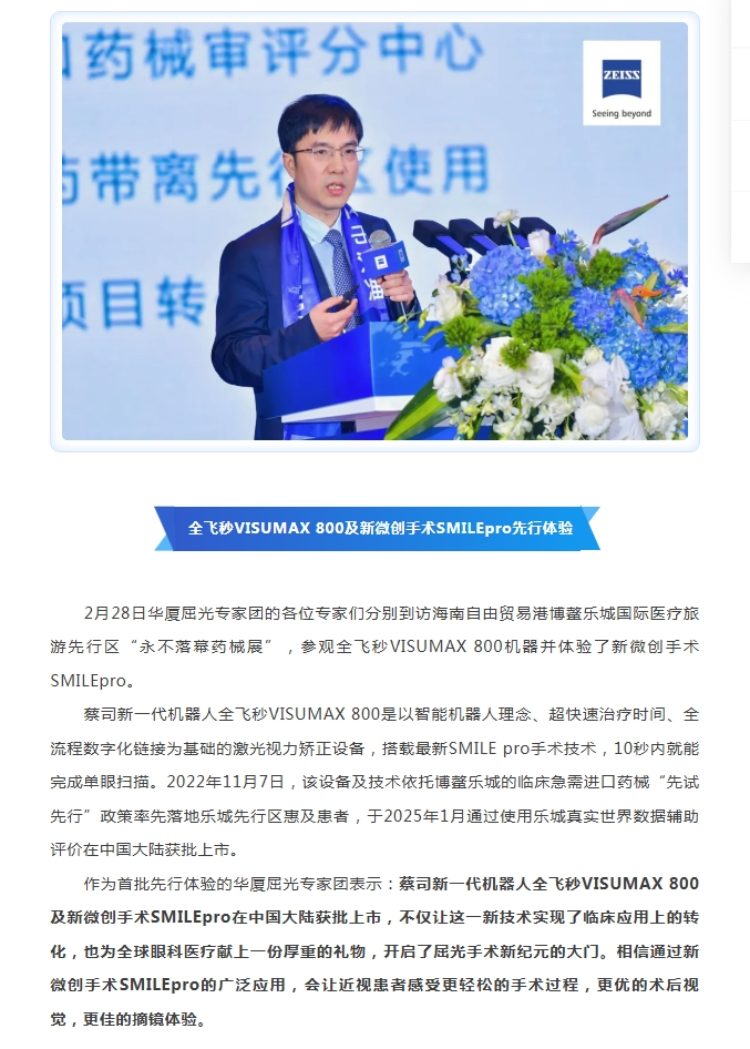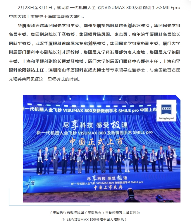 太阳成tyc122cc屈光专家团应邀出席蔡司新一代机器人全飞秒VISUMAX 800及新微创手术SMILEpro中国大陆地区上市庆典