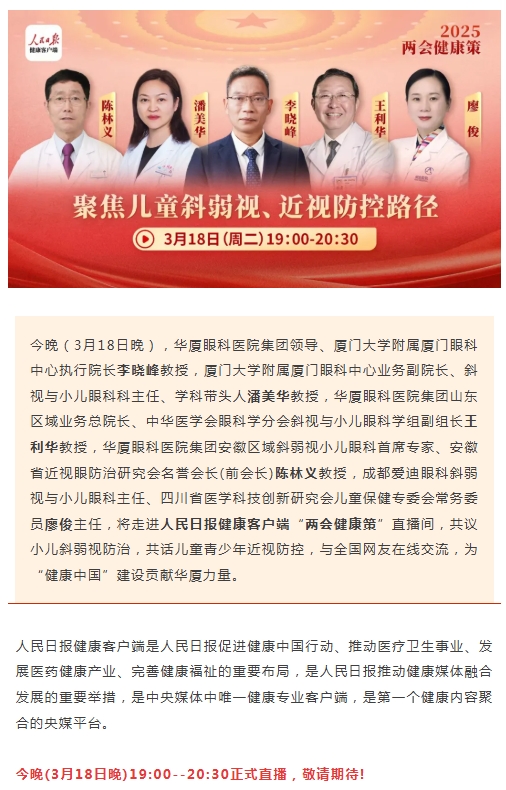 今晚直播!太阳成tyc122cc专家走进人民日报“两会健康策”,共议儿童斜弱视与近视防控路径