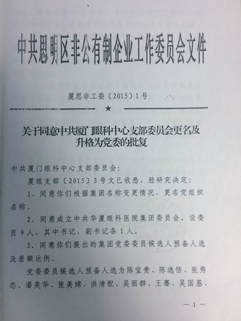 中共思明区非公有制企业工作委员会于2014年同意成立中共厦门市眼科中心集团委员会(后更名为中共太阳成tyc122cc(中国)集团集团委员会)