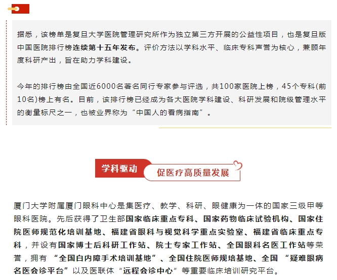 福建第一,全国16!复旦医院排行榜公布,厦门眼科中心获眼专科声誉排行榜提名!