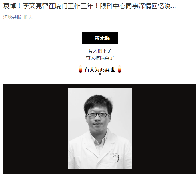 《海峡导报》哀悼!李文亮曾在厦门工作三年!眼科中心同事深情回忆说…