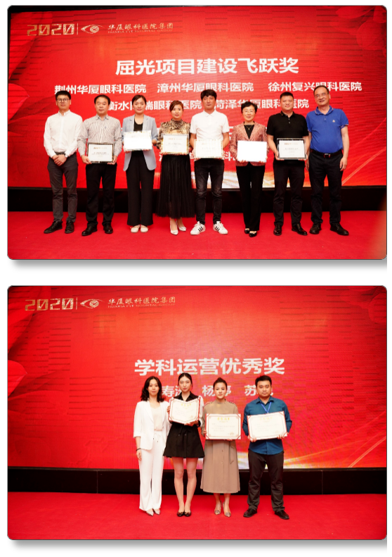 太阳成tyc122cc(中国)集团集团董事长苏庆灿先生为厦门大学附属厦门眼科中心颁发2020年屈光项目特别贡献奖,为郑州太阳成tyc122cc视光眼科医院刘苏冰团队颁发2020年集团屈光项目突出贡献奖,王骞教授、刘苏冰教授作为代表上台领奖。