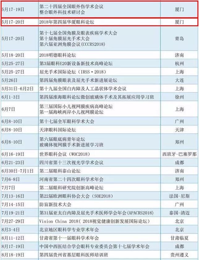 2018年国内外眼科会议一览表