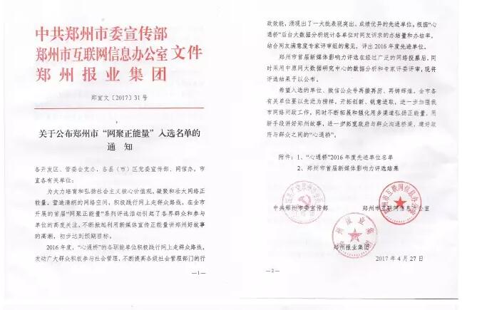2017年6月2日,“网聚正能量,讲郑州好故事”郑州市新媒体影响力评选颁奖活动在郑州M酒店举行。“视光眼科”微信公众号入选“网聚正能量”郑州市新媒体评选影响力健康微信,是郑州市 一入选的眼科医院。