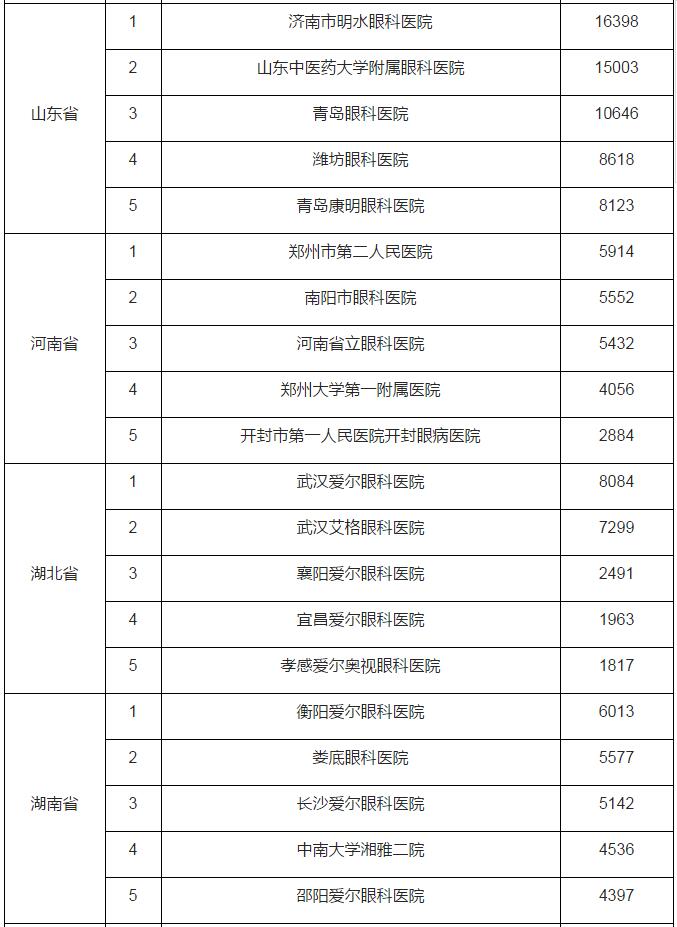 二、2017年全国报送白内障手术 数排名前五位的医疗机构分别是:中山大学某眼科中心、上海某眼科医院、 都医科大学附属某医院、温州医科大学附属某医院和济南市某眼科医院。全国填报 数排名前30位的医疗机构详见如下: